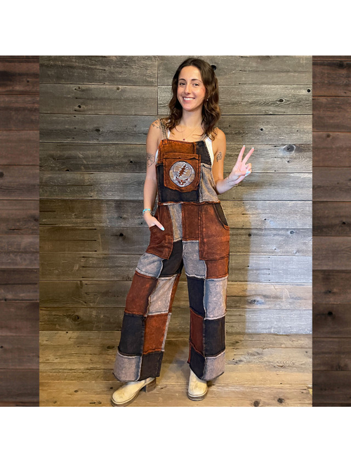 Unisex Stonewash Sweatshirt Fleece Patchwork Overalls w/ Steal Your Face Embroidery & Pockets