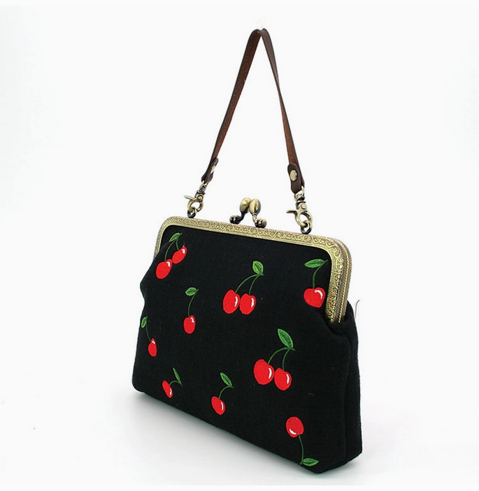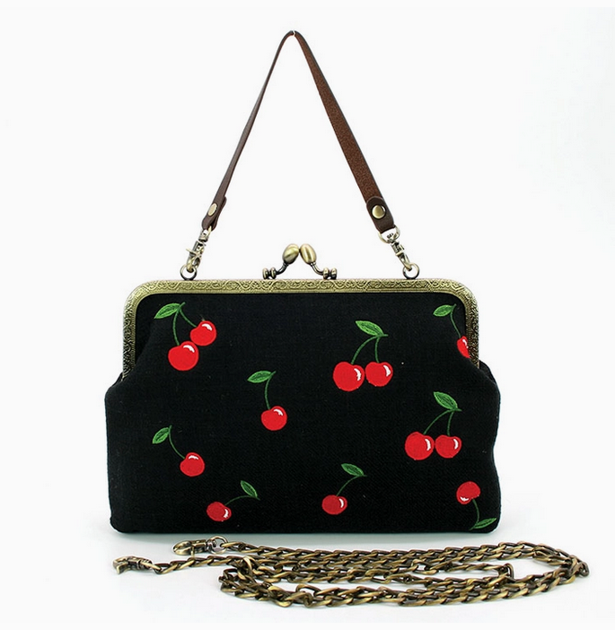 With Kisslock closure, Polkadot fabric lined interior and an Interior zippered pocket