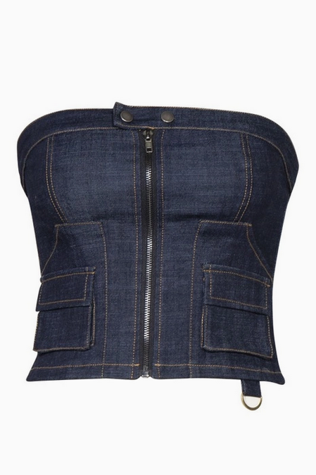 Medium weight durable dark washed cotton blend denim jean that has high stretch